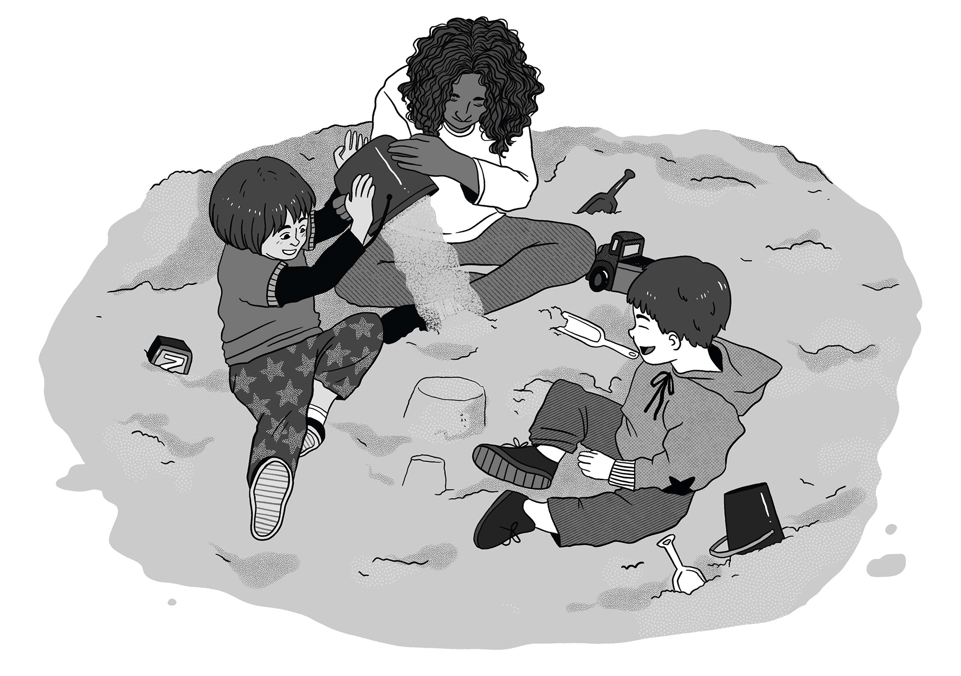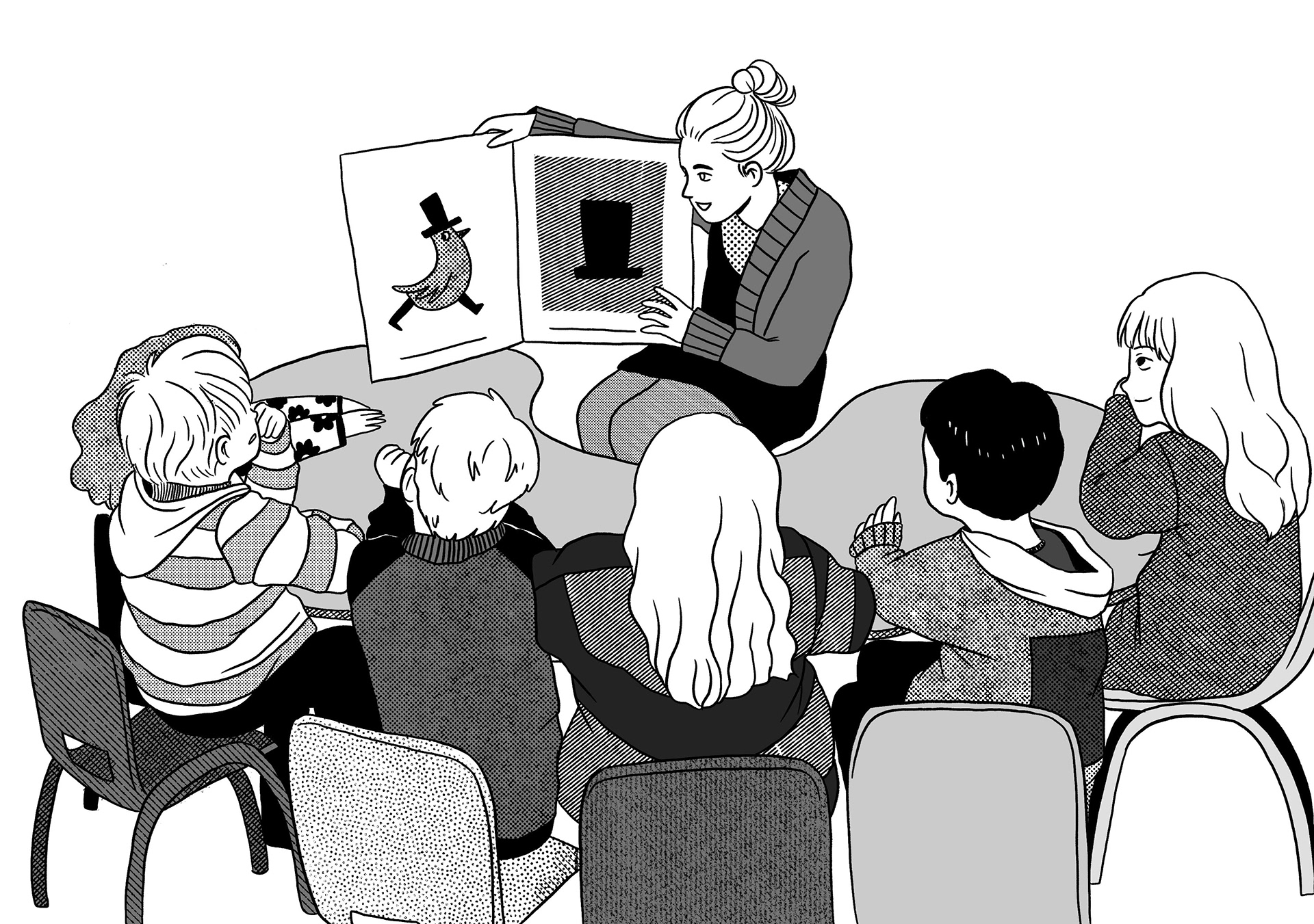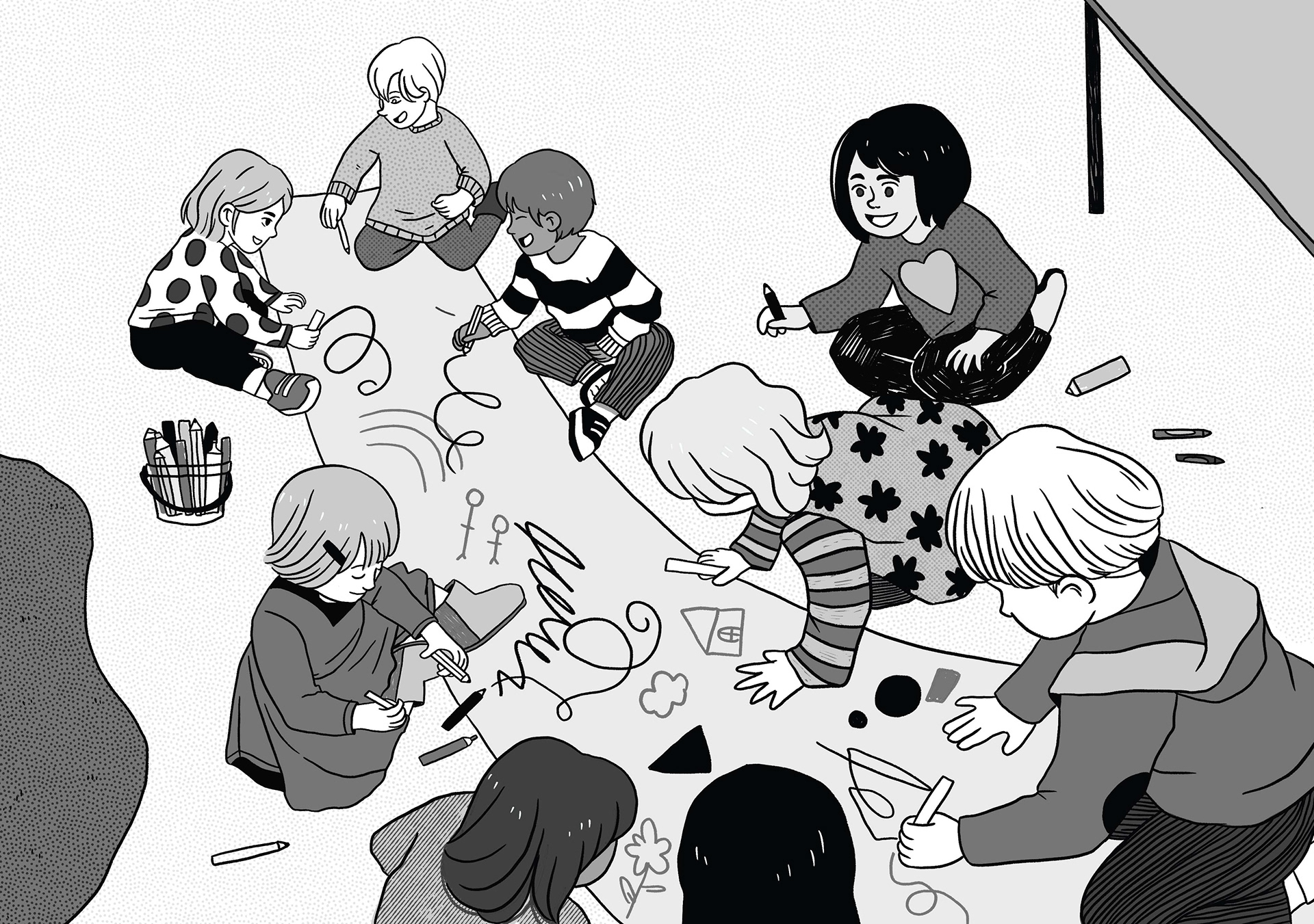 Creación de una serie de ilustraciones en blanco y negro para una publicación de la compañía Autismo Ávila, basado en fotografías compartidas por el cliente.